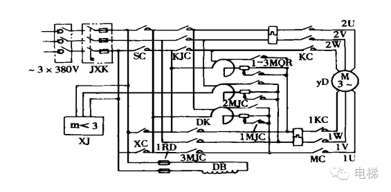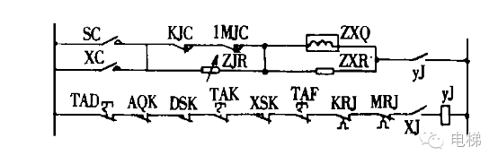 图 1为该电梯曳引电机的主回路 ,当时电梯的快慢车接触器 KC 和 MC 确已断电。因为电梯已换速 ,快车接触器 KC 失电 ,又因为电梯已平层停梯 ,慢车接触器 MC 也失电 ,KC 和 MC 两个接触器的失电使电机定子绕组已脱离三相交流电源 ,曳引电机已无驱动力矩 ,满足上述溜梯条件 ① 。查验资料发现该电梯的平衡系数 K 为 48%,当时轿厢内未进行过二次装修 ,轿厢内只有乙一个人 ,乙的体重按60kg计算。设对重重量为 P对 ,轿厢自重为 P自 ,额定载重量 1000 kg ,设为Q额,则有 P对= P自+Q额 K = P自+ 480(kg) 。当时轿厢内一个人 ,那么轿厢侧重量为P自+ 60(kg),因此对重一侧比轿厢一侧重了420 kg,两侧重量不平衡满足溜梯条件 ③ 。 在制动器线圈ZXQ的控制回路中(图 2),有两个接触器的触点 , 即上升方向接触器 SC(或下降方向接触器XC)与安全回路接触器 YJ 的触点。KJC和MJC为快慢加速接触器的触点 ,平层停梯时这两个触点全部是闭合的。又因有电阻 EJR,这两个触点是不影响ZXQ的断开和闭合。YJ接触器线圈回路中串接有下列安全触点:TAD(轿厢急停开关)、TAK(底坑急停开关)、TAF(机房急停开关)、AQK(安全钳开关)、DSK(限速器绳张紧开关)、XSK(限速器开关) 、KRJ 与 MRJ(快慢车电机绕组的热继电器触点)、XJ(断错相继电器触点)