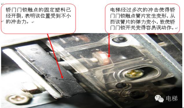 图 3 轿门门锁触点簧片发生变形及固定塑料开裂